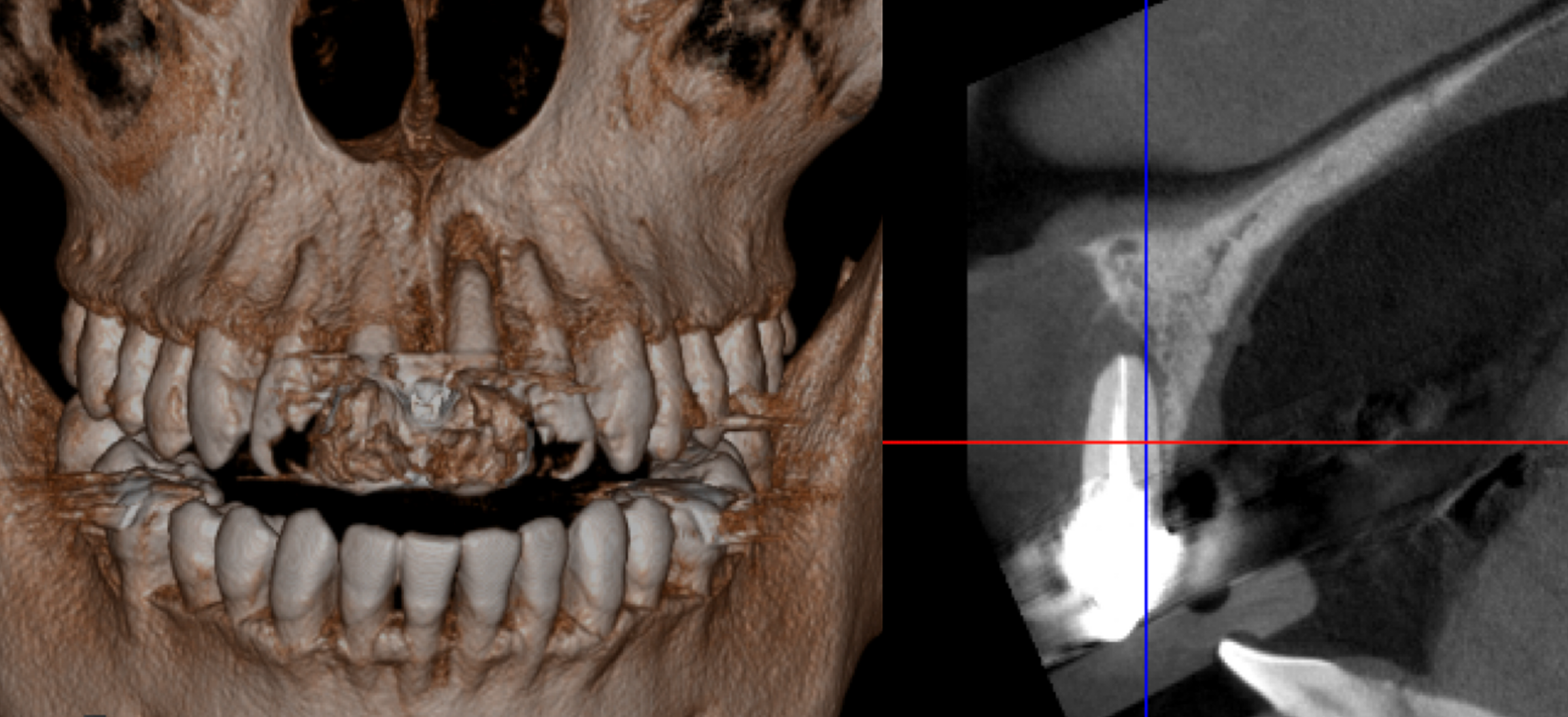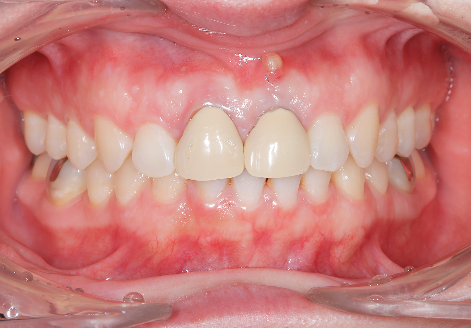 治療概要:左上(写真では右)の真ん中の歯、根元の方にニキビのようなできものができています。診査の結果この歯は根が割れており、抜歯と判断しました。