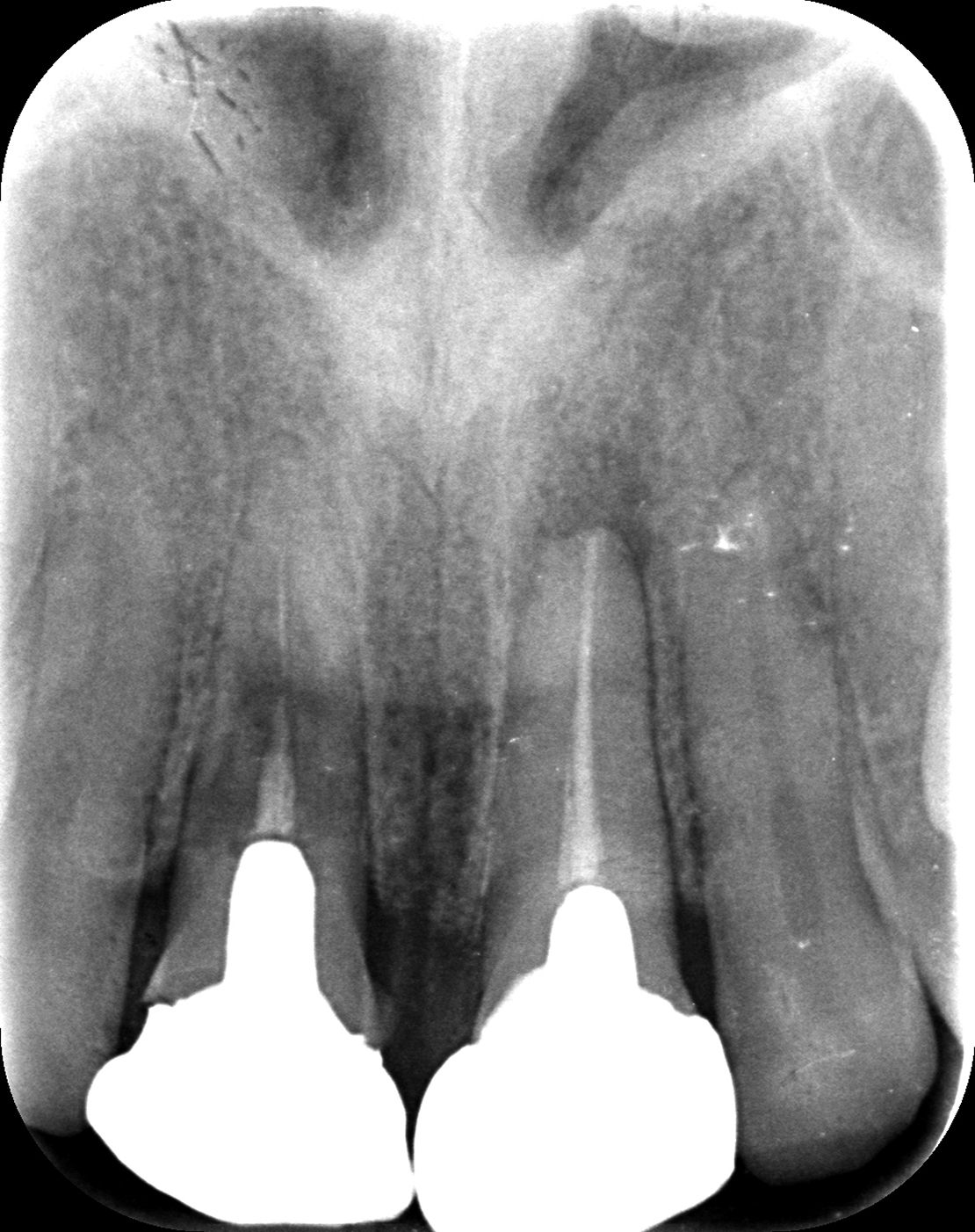 お口全体を検査したところ、自覚はありませんでしたが、右の前歯もレントゲンを見ると歯の根の中腹あたりが溶けてしまっています。この歯も残念ながら抜歯となると判断しました。